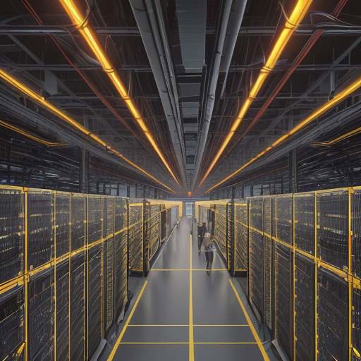 Cinematografischer Blick in ein riesiges Rechenzentrum mit dicht gepackten Servern und einem neuen, modularen Container, der die digitale Infrastruktur modernisiert.